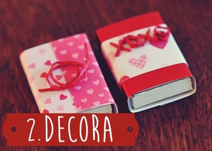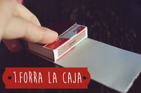 1. Como primer paso, forra las cajas de cerillos con el papel de regalo o las hojas. Utiliza el pegamento blanco para adherir el papel a los costados de las cajas. Espera a que se seque para continuar.