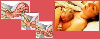 Hasta este momento la madre ya ha dilatado 10 cm por lo que esta más cerca del nacimiento, así que puede que le entre el pánico pero también es posible que recobre los ánimos ya que finalmente hará lo que tanto ansiaba desde hace rato: Pujar con las contracciones. Para el bebé La presión que siente el bebé durante la fase de expulsión es máxima, la salida es estrecha pero ya ve la luz al final. Se acerca una contracción, el bebé siente presión que le ayuda a asomar la coronilla; viene otra contracción, el bebé gira y sale un hombro, otra más y finalmente se desliza fuera el cuerpo. Para él ésta salida es como bajar por un tobogán de cabeza. Una vez fuera del útero vive una sensación rara, nota que le falta su "cueva protectora". Inmediatamente después del desconcierto viene la calma al ponérsele sobre el pecho de su madre quien le rodea con sus brazos. Reconoce su olor y su voz, ahora siente sus caricias directas sobre su piel, que sensación de calma y placer para ambos. Fuente: |