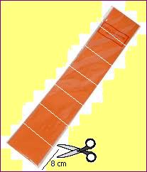 1.- Tomamos un pliego de papel crepe y sin desdoblar lo dividimos en partes de 8 cm. de ancho.