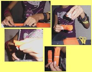 8.- El papel doblado lo sujetas con un trozo de hilo que se amarrará justo a la mitad.
