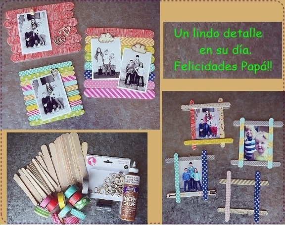 - Para esta manualidad vamos a necesitar pegamento para unir cada palito de madera, algunas cintas decorativas o pintura, decoraciones de plástico, metal o foamy, y por supuesto fotos de familia que las puedes imprimir en casa o de las que tengas de tu papá, hermanos y mamá.