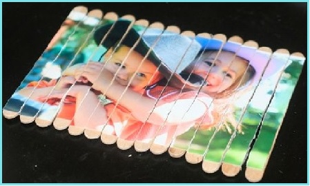 - Elije la foto o fotos que quieres que aparezca en el puzzle. Luego, poniendo los palitos muy juntitos y con un poco de pegamento blanco, pega la foto, procurando que no se separen los palitos. Tenemos que dejar que se seque.